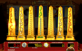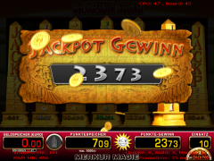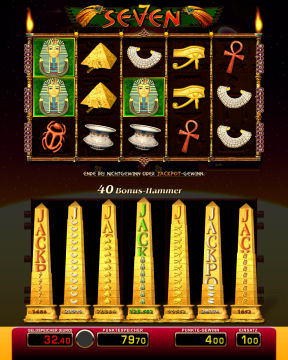 SlidefeatureEs startet nun das eigentliche Jackpotspiel auf dem oberen Monitor der Spielstelle. Dabei handelt es sich um ein 5-Walzenspiel, bei dem Gewinnkombinationen auf 20 Gewinnlinien ausgewertet werden. Auf den Walzen befinden sich ausschließlich die sieben Symbole, die auch auf den Symbolsteinen der Obelisken dargestellt sind. Gestartet wird ein Walzenlauf, an dessen Ende eine Gewinnauswertung erfolgt. Alle Symbole, die sich auf einer Gewinnlinie befinden fliegen nun nach unten und zerstören je einen zugeordneten Symbolstein. Die im Walzenspiel nun fehlenden Symbole werden durch neue, nachrückende Symbole aufgefüllt (Slide). Danach erfolgt eine erneute Gewinnauswertung. Das Sliden, die erneute Gewinnauswertung und die nach unten fallenden Symbole werden so lange wiederholt, bis sich nach einem Slide keine weiteren Gewinnkombinationen mehr bilden oder mindestens ein Jackpot gewonnen wurde.